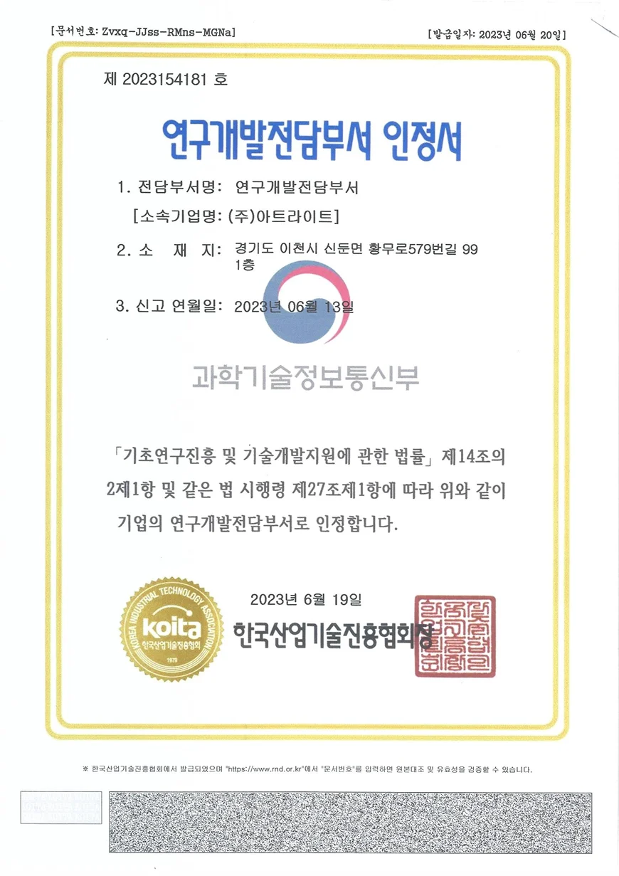 엄격한 품질 관리와 국내외 표준 준수를 통해 검증받은 아트라이트의 인증 내역을 소개합니다.